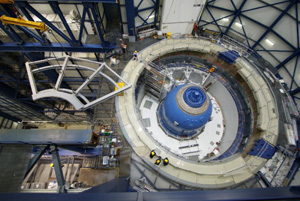 図2 上から見た解体工事中の原子炉本体 および圧力容器(青色) |