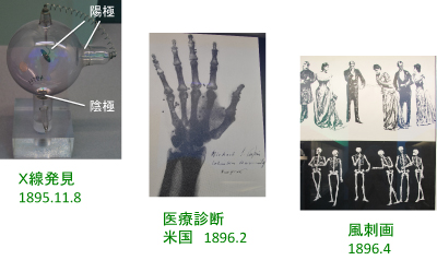 1895年にドイツのレントゲンがX線を発見した直後から、放射線の医療への応用がスタートしました。通信手段が発達していなかった時代にも関わらず、X線のニュースが世界を駆け巡ったことは驚きです。ガラス製の真空容器容器から未知の何かが出ていることからレントゲンは「X線」と名付けたそうです。